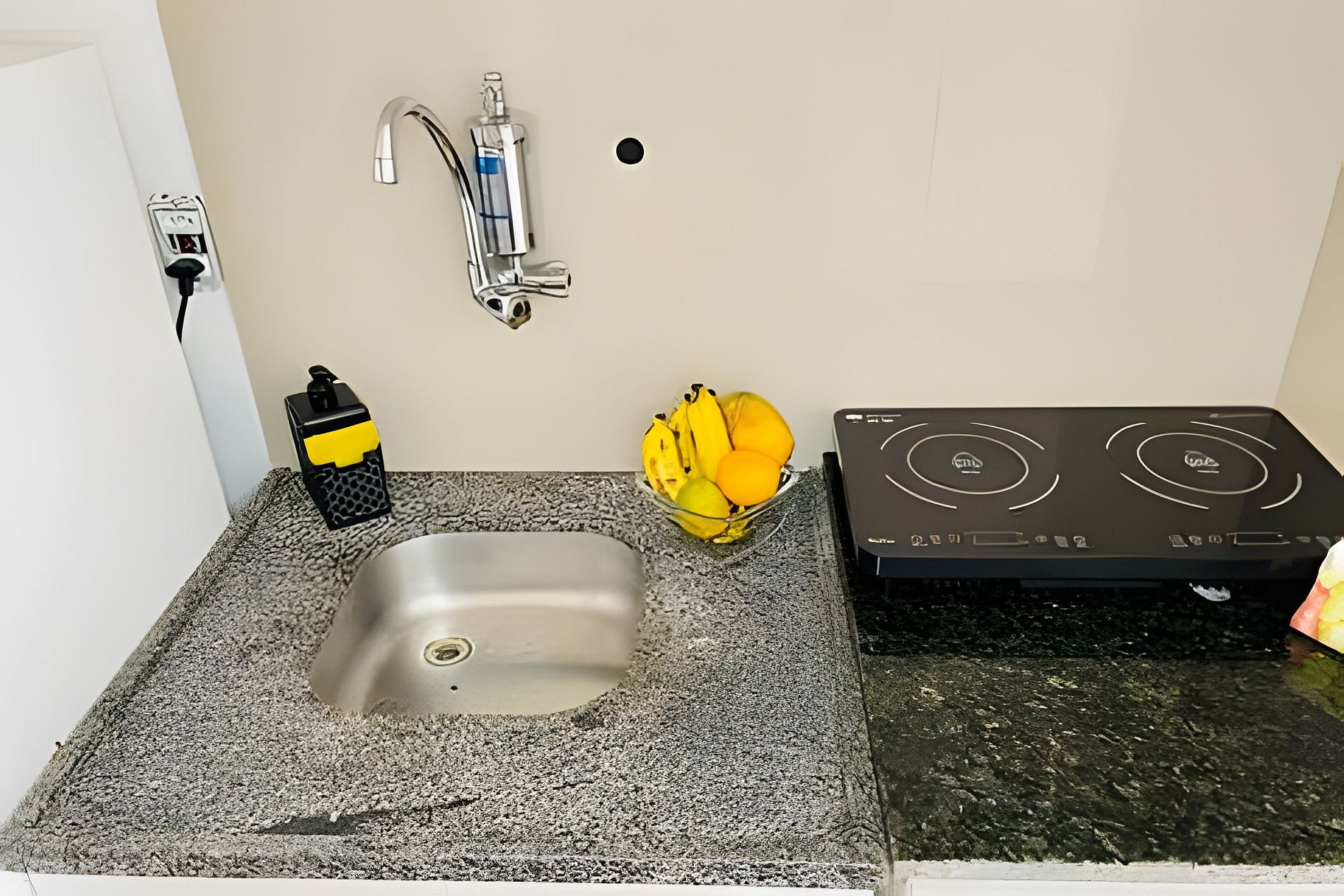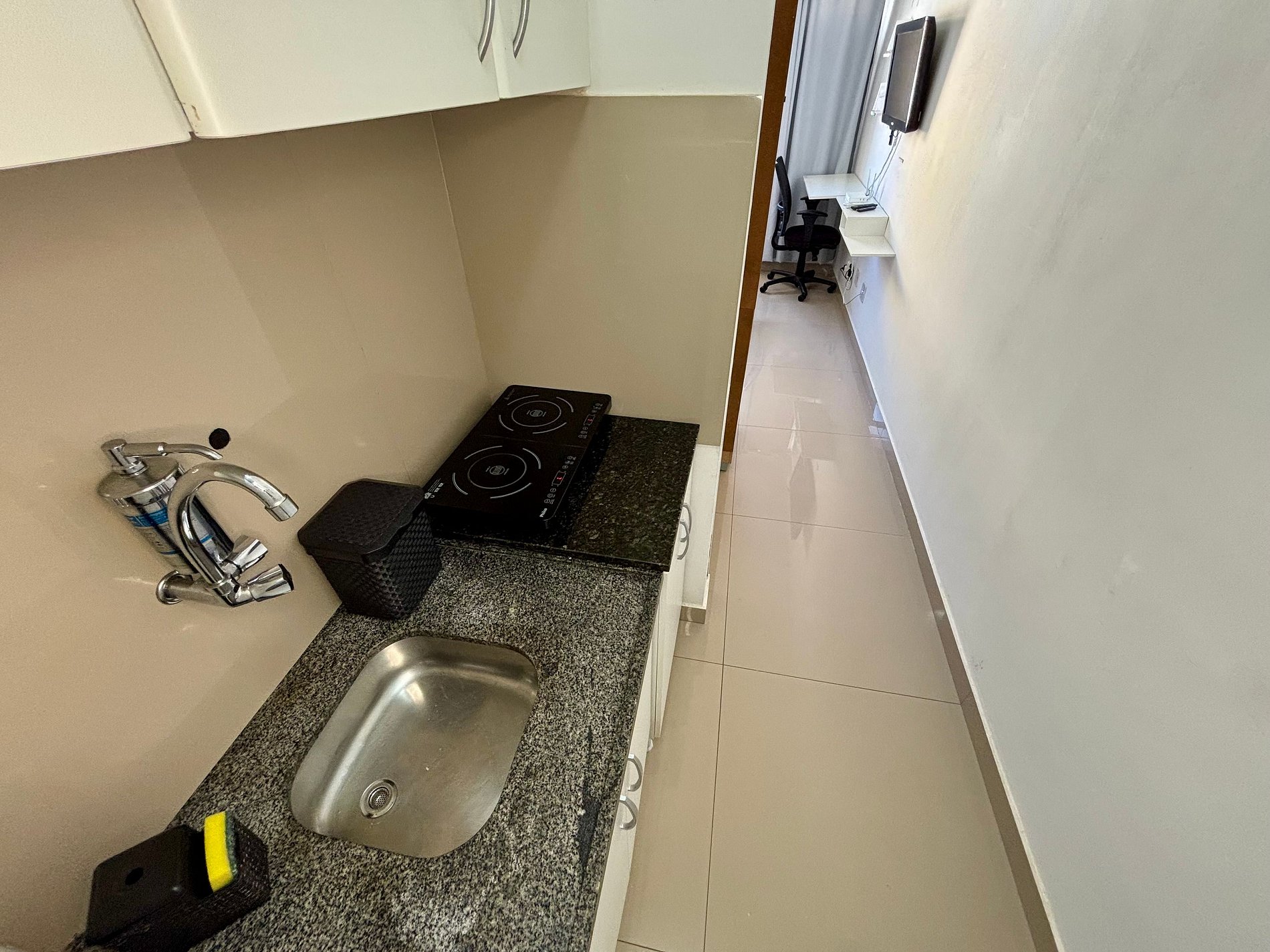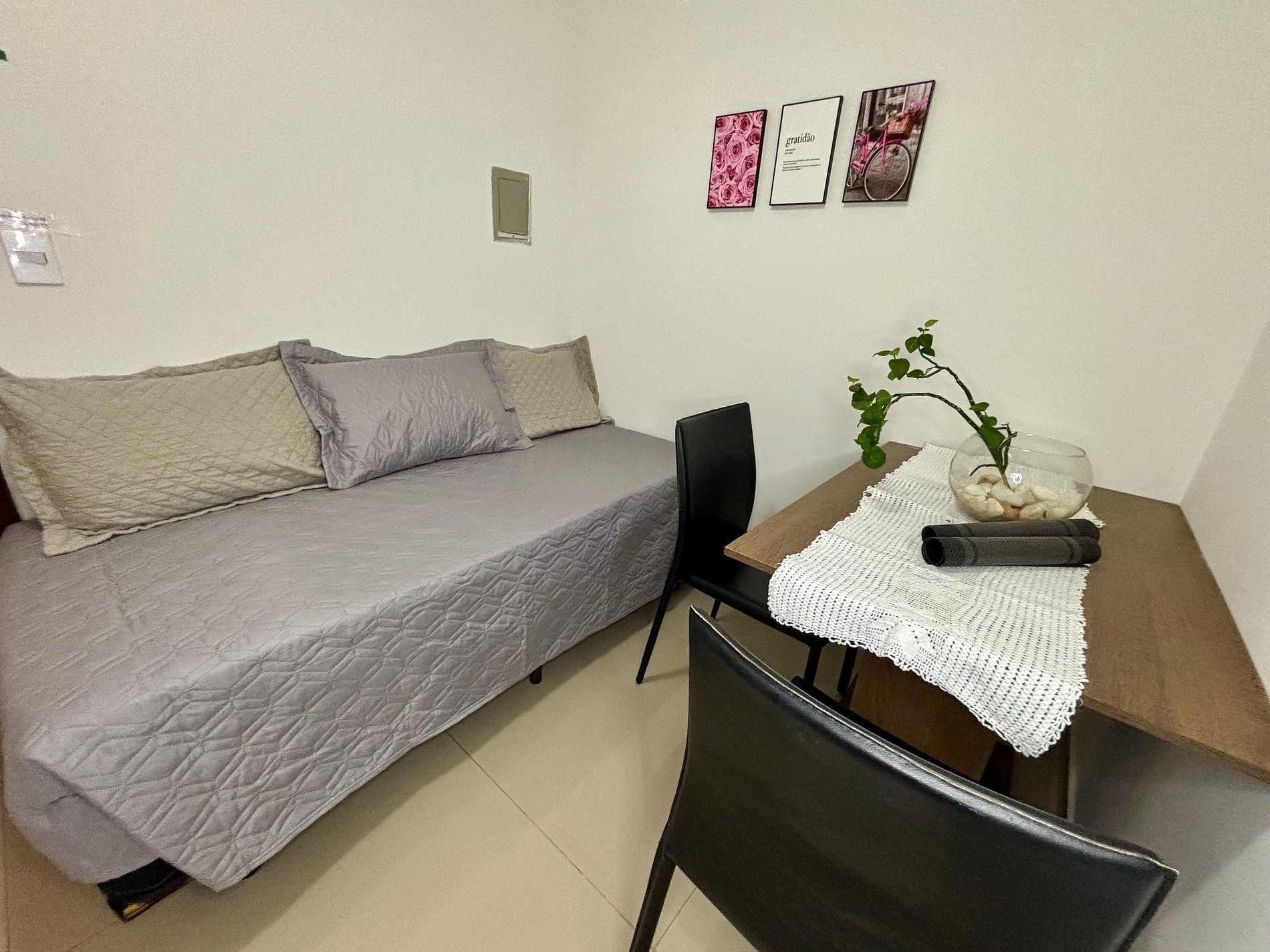 Sala de estar com mesa de jantar e cama de solteiro que pode servir de sofá! Cozinha completa, com fogão por indução de 2 bocas, geladeira, micro-ondas, sanduicheira, chaleira elétrica e liquidificador. Quarto com cama de casal (roupas de cama inclusas) e armário grande! Banheiro completo com box de vidro e espelho!